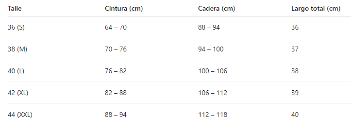 La minifalda es elastizada y adaptable. Recomendamos revisar la guía de talles en la ficha del producto —si tenés dudas, consultanos por chat con tus medidas y te asesoramos para elegir la talla ideal.